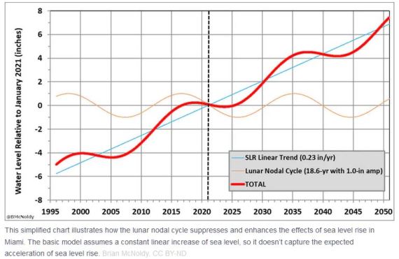Each plateau begins 18.6 years after the start of the previous plateau, or 9.3 years after the end of the previous plateau. In 2037, expect the sea level to be approximately four inches higher than it is right now, then an additional four inch increase by 2056, four more inches by 2075 and again by 2095, at which point sea level will be 16 inches higher than today. And it keeps going. The moon’s 18.6-year orbital wobble is billions of years old. It’s not going away. As long as the sea level rises—fast or slow, linear or non-linear—we will see 9.3 years of plateauing or slight dropping alternating with 9.3 years of rapid rise.