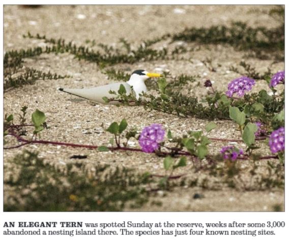 Thousands of Elegant Terns fled Bolsa Chica Ecological Reserve at the May 12 crash. | Los Angeles Times | Alex Wigglesworth | June 8 , 2021