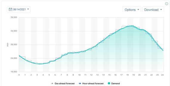 Figure 2. Usage chart for California on 6/14/21, the state-wide highest temperature day so far in 2021. Vertical axis in megawatts, horizontal axis in 5-minute increments. The lowest demand was 21,908 megawatts at 3:40 am, the highest was 35,970 megawatts at 6:40 pm. Average temperature in California ranged 58°-84°F.
