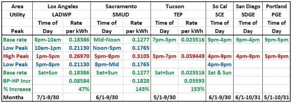 Tucson Electric Power high peak rate is 153% higher than their base rate of $0.023516 per kilowatt-hour. That’s a big increase but from a base rate that’s 87% lower than LADWP.