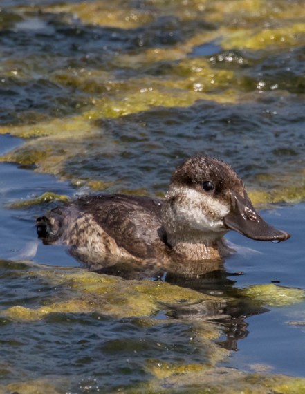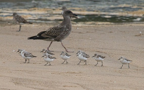 We made our way through the beach crowd enraptured by large, surfer-covered waves, and to the SE corner of the lagoon, past the long flock of gulls, Double-crested Cormorants, Brown Pelican and the many larger shorebirds including Willet, Whimbrel, Marbled Godwit and Black-bellied Plovers. Here, walking on the algae coat, were about 150 peeps—small shorebirds like Western and Least Sandpiper, Sanderling, Dunlin, Ruddy Turnstone, Semipalmated Plover and two Short-billed Dowitcher. Nearby, in the sand, were about thirty Snowy Plovers, doing their best to dodge the many zombified beachwalkers oblivious to the presence of tiny sandpipers underfoot.