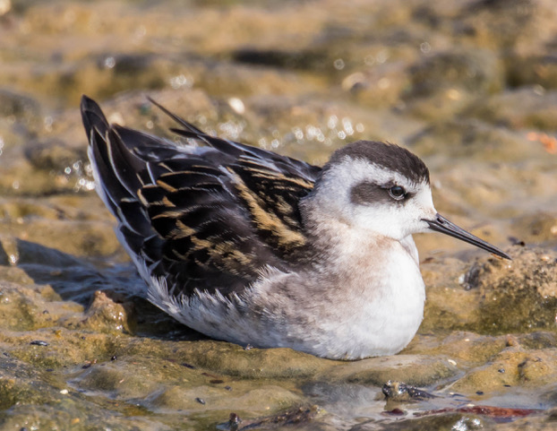 Among the peeps on the algae were a few Baird’s Sandpipers and far out, near the edge of the algal mat, two Red-necked Phalaropes. Unbeknownst to us, Chris Lord was vigorously scope-combing one-by-one through the peeps for the “stint,” subjecting them to this analysis: “It was the only bird I sought in those peeps. I used a yes/no screen until I got to yes! I called our attention to it, ‘That orangey bird is right in front of us,’ then gave better directions.”