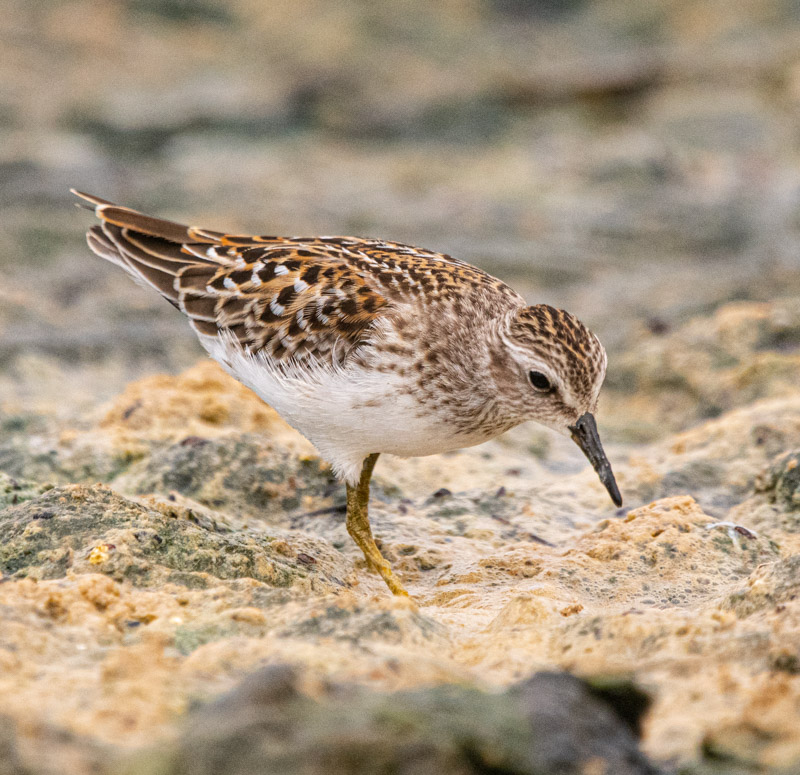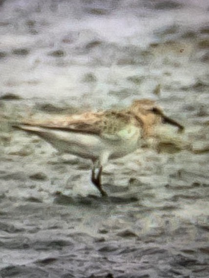 Chris Lord got our attention (not everyone at once) when he said: “I think one of those Baird’s has a darker throat, sort of orange or reddish…not really yellow. Maybe you should take a look at it. It might be something different.” So we all—one by one—figured out where it was and watched it through out binoculars and several scopes, as it walked around, poking at tiny invertebrates on the surface of the algae. Views weren’t wonderful.