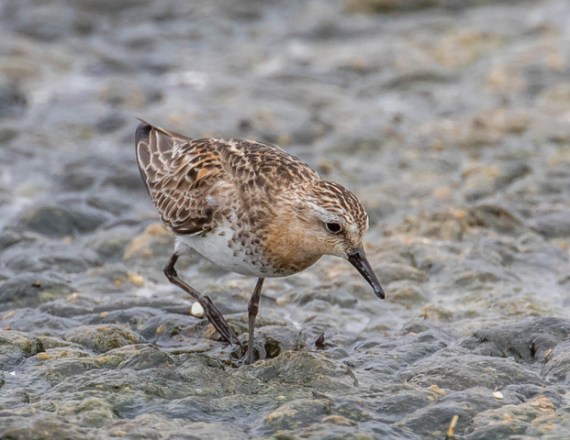 I waved in the few members of our group who were off chatting, and we all got on the bird for at least 40 minutes. The light was better at this angle, the bird was closer, and we slowly became more certain that it was indeed a Red-necked Stint. Not convinced, just more certain. Several of us got photos.