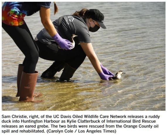 Following up on last week’s blog about oiled Western Snowy Plovers, Los Angeles Times reporter Robin Estrin describes more of the process and the final release back into the wild of an Eared Grebe and a Ruddy Duck.