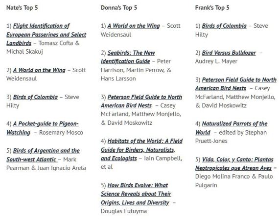 The first group are the top picks from the American Birding Association’s American Birding Podcast’s Birding Book Club’s Best Bird Books of 2021 (whew! – how’s that for nesting?) by three book reviewers & editors. Here is the link to the page, where each title is a link to the book, usually on the Buteo Books website. You’ll note some duplication. How Birds Evolve looks especially interesting to me, but then I already have some of the others.