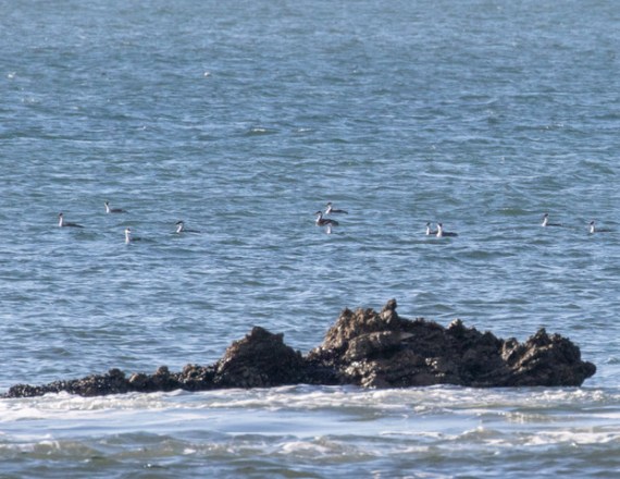 Western Grebe are common in SoCal nearshore waters in flotillas of varying sizes. Loons appear in small numbers: a Pacific Loon today, but a Red-throated Loon last Sunday. Small flocks of Surf Scoter dotted the water, several svelte Pelagic Cormorant dove in the surf zone, and – more unexpected at sea – a nice-looking Red-breasted Merganser about 100-200 yards out.