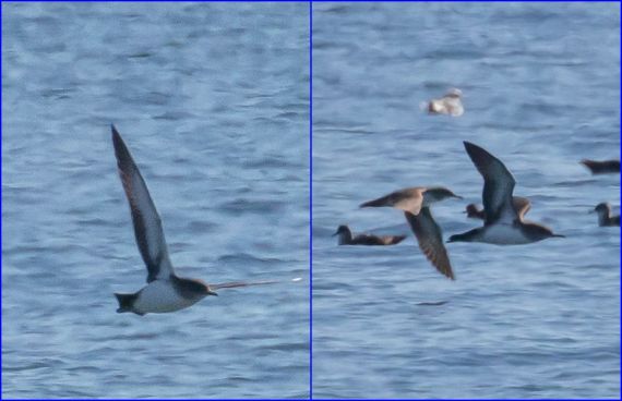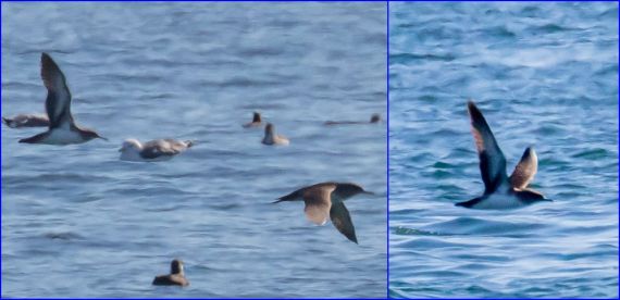 At this distance, they were little more than tiny dots in the telescope. But shearwaters fly in a very distinguishable manner, described by their name – Shearwater. They fly very low, often barely skimming the surface of the water. Usually they’re actually in the troughs between waves, barrelling along what to them looks like a long narrow valley, often out-of-sight of land-based birders. Every so often they rise up, only to quickly drop out of sight.