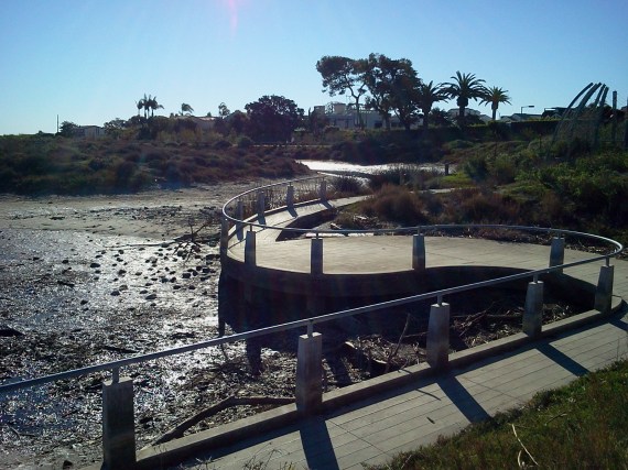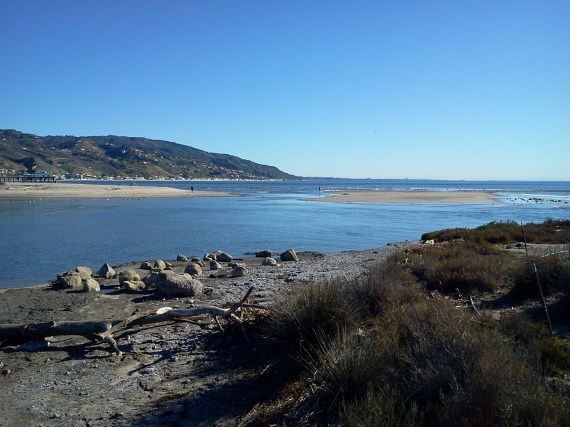 As always, the lagoon outlet moves eastward over time. Occasionally it doubles itself, as seen here. The eastern edge of the outlet will continue to erode and the western edge – or in this case, edges – will continue to fill in, so the outlet seems to move. Eventually the whole thing fills in and usually stays closed for 4-6 months during the summer. It may come up against the riprap rocks edging Adamson House, if we get more rain and stays open long enough. If no more rain the outlet usually fills in as more sand arrives.