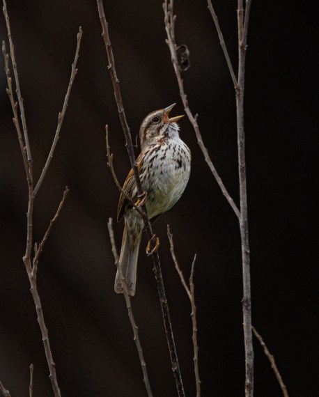 Firstly, the Song Sparrows and White-crowned Sparrows were singing like crazy. What a racket! All along the pathways we were surrounded by songsters. You would have thought it was springtime. It gave us a great opportunity to hear these two quite different songs and compare them, over and over and over. I think a few people learned to tell the difference. White-crowned Sparrow: a nasally slightly whiney song with a narrower range of frequency than the Song Sparrow, thus sounding a bit more ‘tinny.’ Song Sparrow: richer song, wider frequencies, three parts – slow, fast & short, slow. The three parts can vary widely in content; the last time I read about the Song Sparrow, a few years back, the count was up to 95 different song varieties across their continent-wide range.