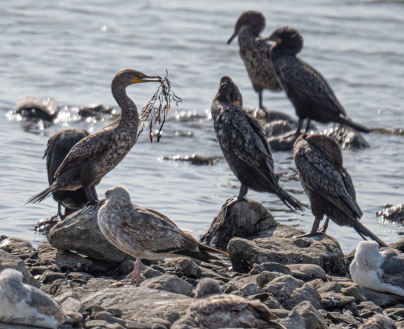 Killdeer are probably nesting somewhere on the beach or sandy islands, but we didn’t see any signs of them. Double-crested Cormorants are also up their old tricks with sticks and strands of kelp streaming from their bills, from the beach to their several nesting trees in the shopping center.