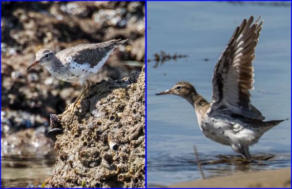 Unlike Western and Least Sandpipers (and the occasional Dunlin and Red-necked Stint), they don’t freely associate with other species of small sandpipers (aka ‘Peeps’), and just barely associate with other Spotted Sandpipers. When we have 2-4 at the lagoon, a typical number range, they’re all in different places, not hanging out with each other. This is reminiscent of the very-well-named Solitary Sandpiper. I’ve never seen more than one ‘Solitary’ at a time, anywhere, ever. Perhaps they reproduce by parthenogenesis, or budding off clones of themselves like coral polyps.