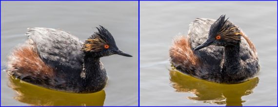 It was really nice to see an Eared Grebe in breeding (alternate) plumage. You can see their ears, for instance, those bushy reddish-brown feather-sprays sprouting from behind their eyes. Most of the time when they’re here they’re in their basic (non-breeding) plumage, but sometimes, just before they leave for the north, they grace us with their finery.