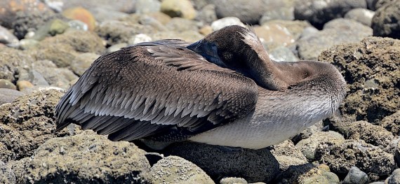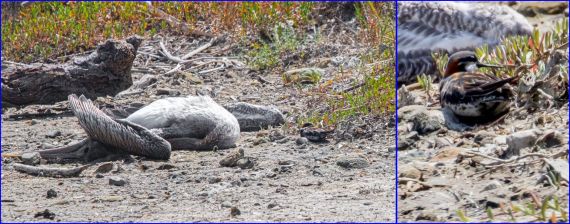 There has been a drop in the local population of whatever fish the Brown Pelicans like to eat. Some of them are starving to death, literally, and we saw perhaps six pelican corpses on the edges of the lagoon and on the beach. One such corpse was in close proximity to the sleeping Red-necked Phalarope.