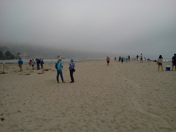 Once again the June Gloom fog came to our rescue. The fog kept the temperature comfortably between 65-70°F. The waves came in sets, so the surfers were mostly sitting on the water…make that sitting on their boards on the water. Twenty-two birders showed up — almost as many birders as there were species of birds.