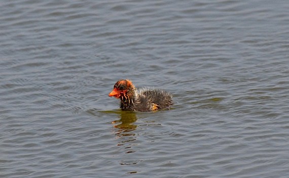 Baby American Coots are surprisingly colorful. (Larry Loeher 8/26/22). Here’s a thesis waiting to be written. Why are they colorful, when most precocial young are cryptic?