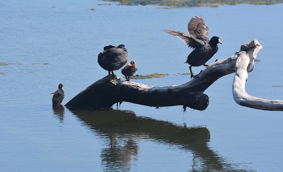 The coot family. (Larry Loeher 8/26/22) While feeding, each adult had one chick. Notice the stubby little wings on the chicks.