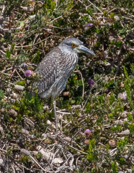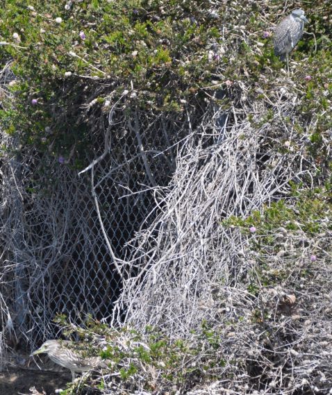 Well…it showed up for a few of us, anyway. Most of us, including me, did not go all the way around the lagoon to the Adamson House fence where the YCNH has previously been sighted, where it was today, and where I searched diligently for it last month but to no avail. (Cue: great gnashing of teeth) Last month, from across the lagoon, I could swear I had the bird, but when I reached the fence, alas, only a Black-crowned was to be seen. Now we find the two species in the same blasted bush! that I was looking at last month. Pretty sneaky, I say. Anyway…kudos to Chris Tosdevin and Blair Lord (on loan to us from Pasadena Audubon) for making the extra effort and getting these photos.