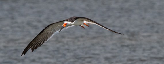 We get Black Skimmers more often that one might expect (12% of the most recent 147 visits), and a few more dropped in today. They feed by skimming just above the water, with their elongated lower mandible cutting through the surface. When they sense something worth eating, the quickly (very quickly!) snap it up. I keep waiting for one of them to hit something solid and flip end-over-end, but I’ve never seen it happen.
