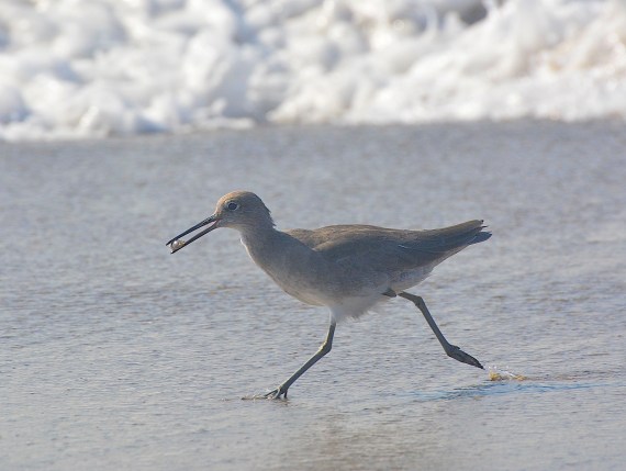 The Willet, at 15″ tall (long?) versus the Snowy Plover’s 6.25″ is not afraid of a little water. It’s the best way to find those little sand crabs stirred up by the rushing water.