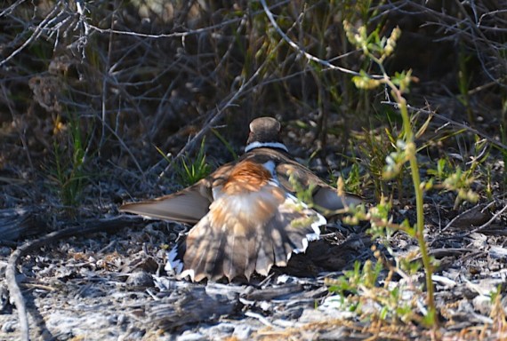 Killdeer nest regularly at the lagoon. Their chicks have a single black stripe on the neck/breast and — as with most toddlers — unsteady on their feet.