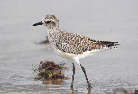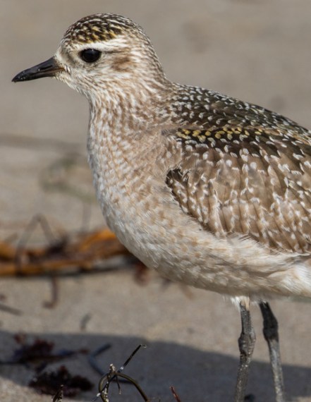 Slender plover spangled with gold. Breeding plumage shows black belly and face with mottled white sides and undertail coverts and a white stripe down the side of the neck that continues onto the sides of the chest and flanks. Nonbreeding plumage is duller grayish-brown overall with a variable golden wash, often quite bright. Juveniles are crisp and neatly spangled above, washed with gold on the upperparts. At all seasons, note more slender shape, slightly smaller bill, and brighter golden tones than Black-bellied Plover, along with grayish underwing in flight. Extremely similar to American Golden-Plover; Pacific is slightly shorter-winged, longer-legged, and larger-billed, but these features are difficult to judge. Juvenile Pacific is usually brighter than American, especially on the face and neck. Pacific found more regularly on beaches and mudflats than American, but much overlap; also note range. Breeds on Arctic tundra from Alaska to Russia. Winters extensively across Southeast Asia, the South Pacific, Australia, and New Zealand; small numbers found in fall on west coast of U.S. Note voice: a quick “pip” note followed by a rising “plooEEP!”, first note shorter and more clipped than Black-bellied. Also makes shorter, more plaintive calls similar to American but lower-pitched.