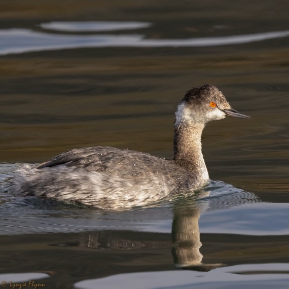 Eared Grebes have a dingier neck-front than Horned Grebes. Also a pointier crown, an often slightly-fluffed tail than doesn’t slope gently down to the water (thanks to Chris Lord for that point), the bill is slightly upturned, and the white patch on the side/back of the neck is usually disconnected to a quite variable degree from any white on the chin or throat. They are also a whopping 7.4% smaller! And a lot more common in SoCal! Nevertheless, the two are often confused.