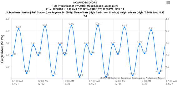 The temperatures were exceptionally nice for Christmas Day: 65°F when we got there, 72° when we left. [A week later they were 20° lower.] Tide was high, +6.59 ft. at 9:50 am., dropping from the King Tide highs of 6.84 ft. the day before, and 6.86 ft. the day before that. In case anyone is wondering and as you can see by the chart below, the “King Low Tides” (to coin a phrase) of the year occur right after the highs.