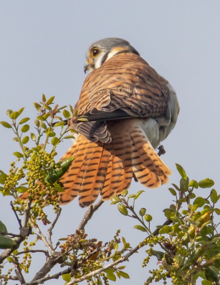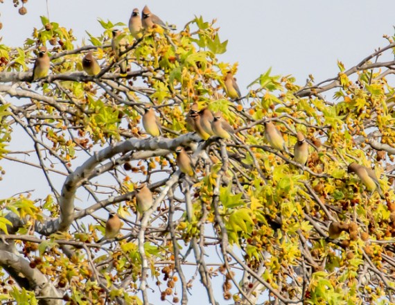 A female (brown back) kestrel landed in a nearby tree, but didn’t try to make any moves on the waxwings.
