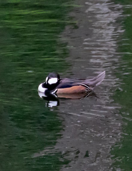 After watching the waxwings for a while — they’re a treat to see and we don’t see them every year — we wandered over to the “sump.” This area is fenced in to keep people — who may be wandering around and not watching where they’re walking because they’re fixated on looking at some bird — from falling down the sides. It’s a deep hole perhaps 75 yds. across, maybe farther, originally dug to drain water out of the surrounding marsh. This water eventually runs through a pipe and out to the ocean, but creates a small pond in the meantime. Some birds appreciate its privacy and shade, including a half-dozen Hooded Mergansers, like the snoozing male below. We also found a Green Heron that was actually green, unlike most of them, lurking in the pondside brush.
