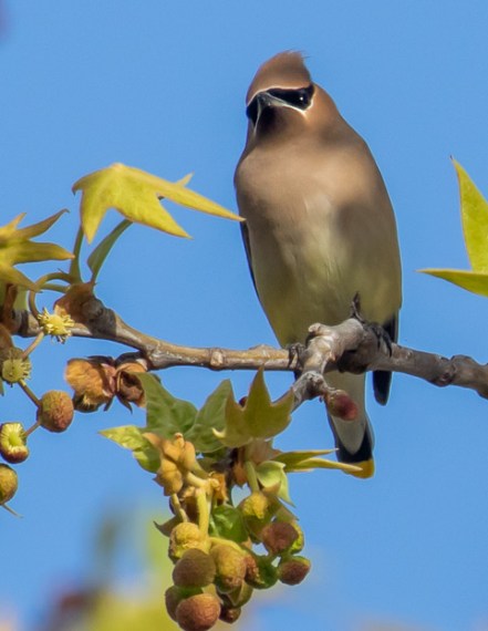 A few of us had heard Cedar Waxwings overhead but couldn’t see them. It is often said that when you begin to lose your hearing, the song of this species is the first to go. I don’t know if that’s absolutely true, but I can attest to the fact that I haven’t heard them in about 20 years. However, I did spot two flocks fly by overhead (hint: they’re always in a flock of 10-100 birds) before I spotted one come low and fly into a tree, where they stayed for quite a while.