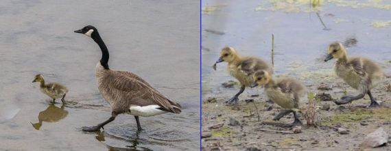 Four of the five Canada Geese present. They’ve been breeding at the lagoon on the sandy brushy islands for at least the past three years. One pair this year, but there were three pairs one year. (Left: Ray Juncosa; Right: Chris Tosdevin, 5/28)
