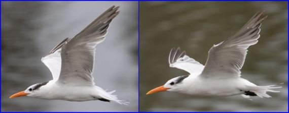 The same Royal Tern a split-second apart. Does the bill seem thicker that those of the birds in the photo above? The dark eye and nape fringe are definitely Royal. (Chris Tosdevin 5/28/23)