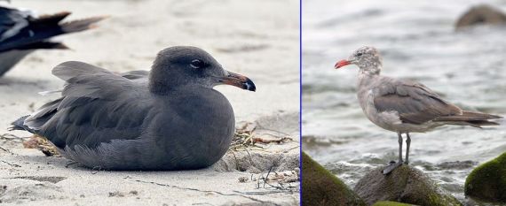 Two Heermann’s Gulls: Left 2nd year, Right probably 3rd year. (L: Lynzie Flynn 7/23/23, R: Grace Murayama 7/28/23)