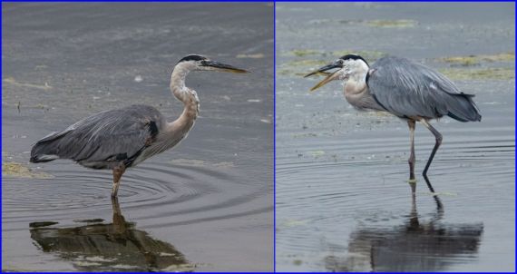 Great Blue Herons. Look very closely at the right bird; that tongue is not a tongue. (7/23/23. Left: Ray Juncosa, Right: Lynzie Flynn)