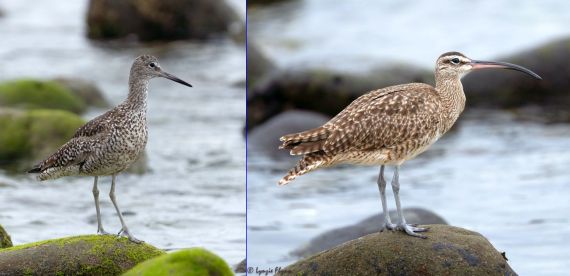 Willet and Whimbrel on exposed rocks (Lynzie Flynn 7/23/23)