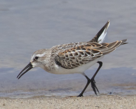 Birders tend to confuse the smallest peeps with each other — the Least and the Western for example. As befits the name, the Least is the smallest peep, 1/4-1/2″ smaller than the Western. This time of year they can appear in juvenile, breeding (alternate), or winter (basic) plumages. The Least (below) tends to be a bit “warmer” brown , more streaky breast with a shorter slightly decurved bill and yellow-green legs. Westerns never have yellow-green legs, so thats a good “quickie” field mark, but which needs to be confirmed with the other marks. But sometimes the Least’s legs can look black from mud or shadow. Check the legs on this bird below. Black. But it looks like a Least, with warm brown colors, especially on the breast. Check that one toe in the sunlight. Yellow-green. Ah hah!