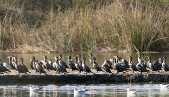 Double-crested Cormorants were present on the bay, but we didn’t see many until we came upon this group on a mud embankment at San Joaquin Marsh. It wasn’t particularly hot but they were practicing their gular fluttering, perhaps for when they really need it next summer.