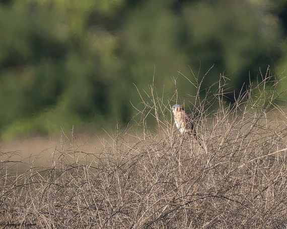 The hawk above was in a damp field with a small rodent (zoom in on left photo). Far far away, nearly all the way across the bay we spotted this American Kestrel which – judging by his blue-gray crown – is male.