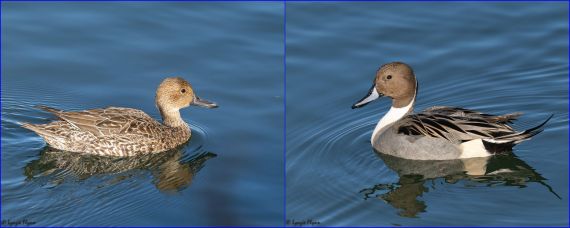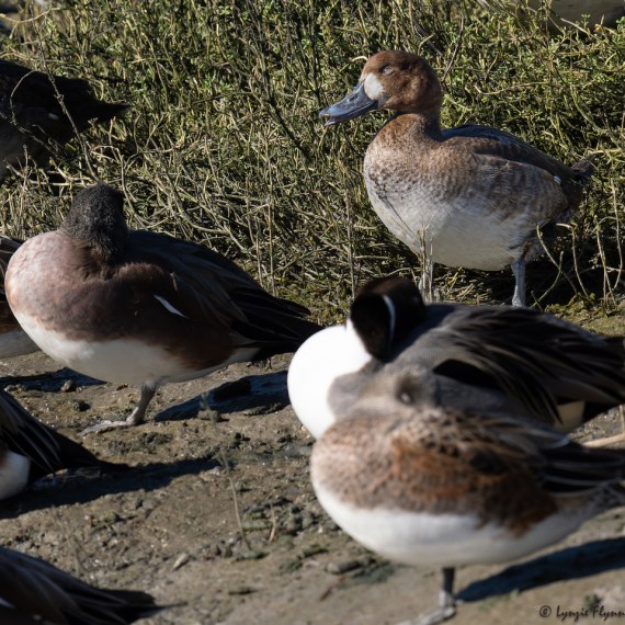The tail of the male Pintail is very long and pointed, the female not so much. The bill is the same shape and length (the female above was a bit farther away), but the patterns differ. The female bill is all black; the male’s is baby blue bordered in black. Both sexes are sleek with slender necks and smallish heads. We spent some time trying to figure out these females who were out swimming around by themselves among the wigeons, and finally settled on the bill-neck-head shape and proportions as most useful.