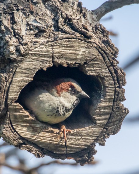 We hopped in our cars and drove the immense distance of nearly 1/4 mile over to the southeast corner of the park, across Victory and to the south end of Garden St. This is the major access point to the Riverwalk. As small as the portion of the picnic park located here is, it had even more birds than the larger section we’d just left. House Sparrows are typically the opposite of a big deal to birders, and I doubt that 1% of field trips reports anywhere, ever, bother including a photo of one, but this bird was doing something interesting.
