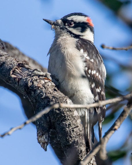 We had four species of woodpecker in this section: Acorn, Nuttall’s, Northern Flicker and Downy, the smallest of our American woodpeckers. At 6 1/2″, it’s not much larger than the diminutive Chipping Sparrow we’d just seen.