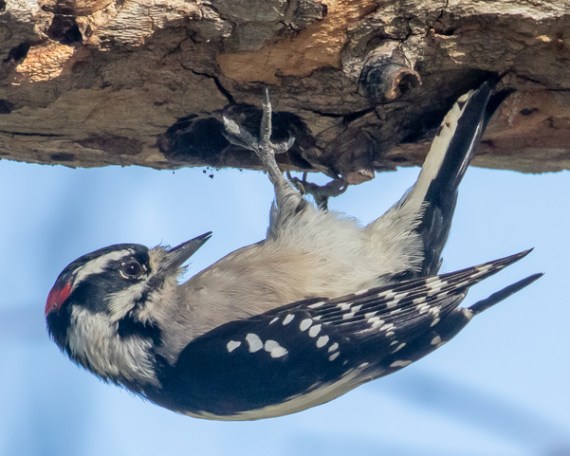 As you can see from the photo above, Downy Woodpeckers are lighter-than-air, like tiny feathered dirigibles, and could walk upside down on your ceiling if they had a mind to. Well…maybe not. Maybe it’s those clawed toes.