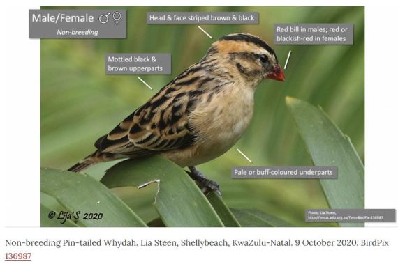 Pin-tailed Whydah, non-breeding males: (L-Ray Juncosa, R-Chris Tosdevin) 2-10-24