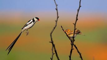 Male Pin-tailed Whydah displays to female (BirdfindingInfo.com)