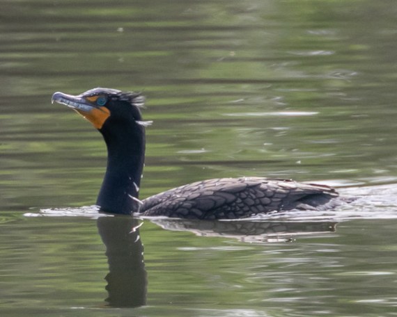 There are five other good field marks to look for, usually visible if not too far away. The Neotropic’s bill is smaller and the likewise-smaller gular pouch is a slightly darker orange. The angle of orangish flesh at the corner of the mouth gape is more acute. The white line edging the gape is (barely) present in juveniles and quite bold in adults in breeding, more extensive and brighter than in the Double-crested, which often doesn’t show any white at all. Lastly, the Double-crested always has yellow flesh above the dark loral stripe, brightest and largest in the adult. The Neotropic never has yellow in this location. Look closely at these three photos and you can see all these field marks. All this valuable information is in your handy paperbound field guide, of course, which you always carry into the field, of course, so it’s always close at hand. Of course.