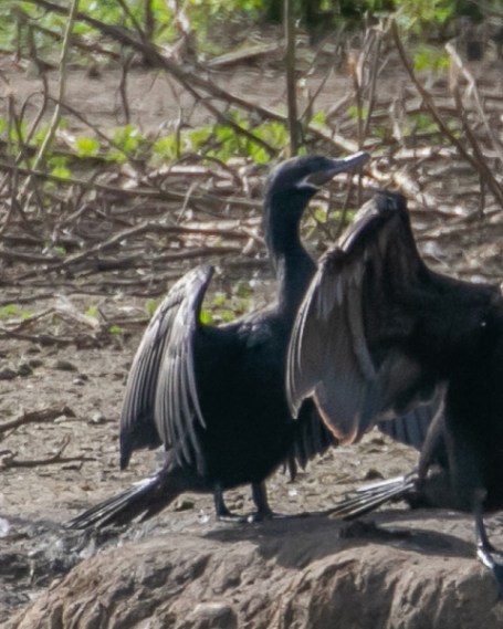 Although the Neotropic is significantly smaller than the Double-crested – length 26″ wingspan 40″ versus length 36″ wingspan 63″, it’s surprisingly difficult to see this difference in the field. It helps a great deal when they’re standing erect right next to each other and all facing sideways in the same direction as pictured above. Put them up in a tree on different branches, crouching or snoozing, or lounging on a log in a lake and you might not find it quite so easy.