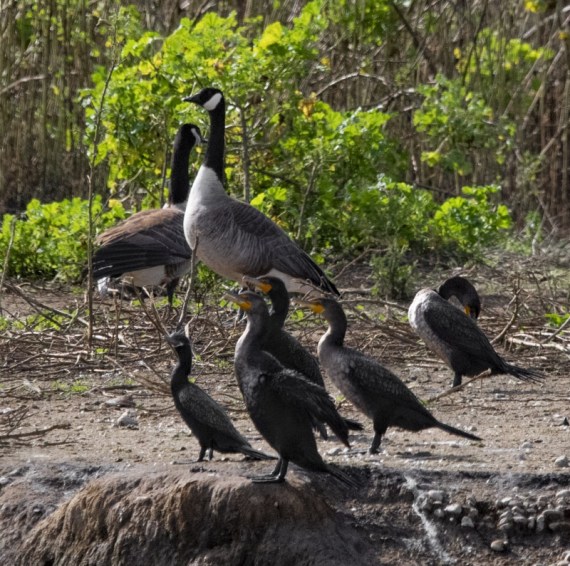 Probably the bird of the day (Ta-Dah!) was the Neotropic Cormorant which – after several years of just missing it or having poor and uncertain looks – we finally got a good, unmistakable look. It’s the smaller, leftmost cormorant below; the others are all Double-crested (save for the geese, of course). It was probably a life bird for some and certainly a County Bird for others.