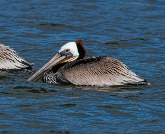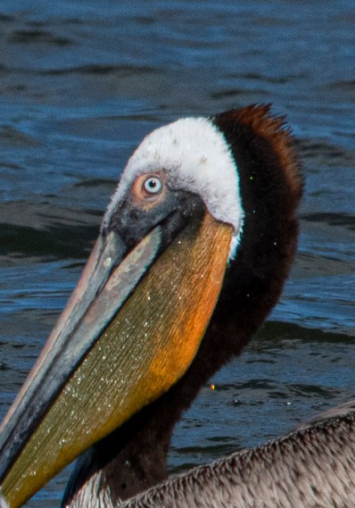 Their nest building takes 4-10 days, egg incubation takes 29-32 days, and fledging occurs 11-13 weeks after hatching, depending on which expert you consult. Add that up and it can take 133 days or 4.5 months from the first nest stick to the last flight from the nest. Thus the long breeding season. Compare that to the Anna’s Hummingbird which spends about one-third that time (48 days) from start to finish. Size matters, and the Brown Pelican (48″ long, wingspan 84″, 5.9-11 lbs) is among our largest birds. The photos below display a variety of plumages and skin colors. The young are largely brown, but by the time they reach breeding age, their body plumage is really more silvery and the chocolate-brown is on their neck. The white forehead can become quite golden.
