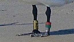Anyone know the bird above? It’s loaded down with leg bands: left leg has orange-red over blue-green, plus something silvery below that; right leg has a large coded band that looks like it might read “CC”-something. Here’s an almost useless close-up.